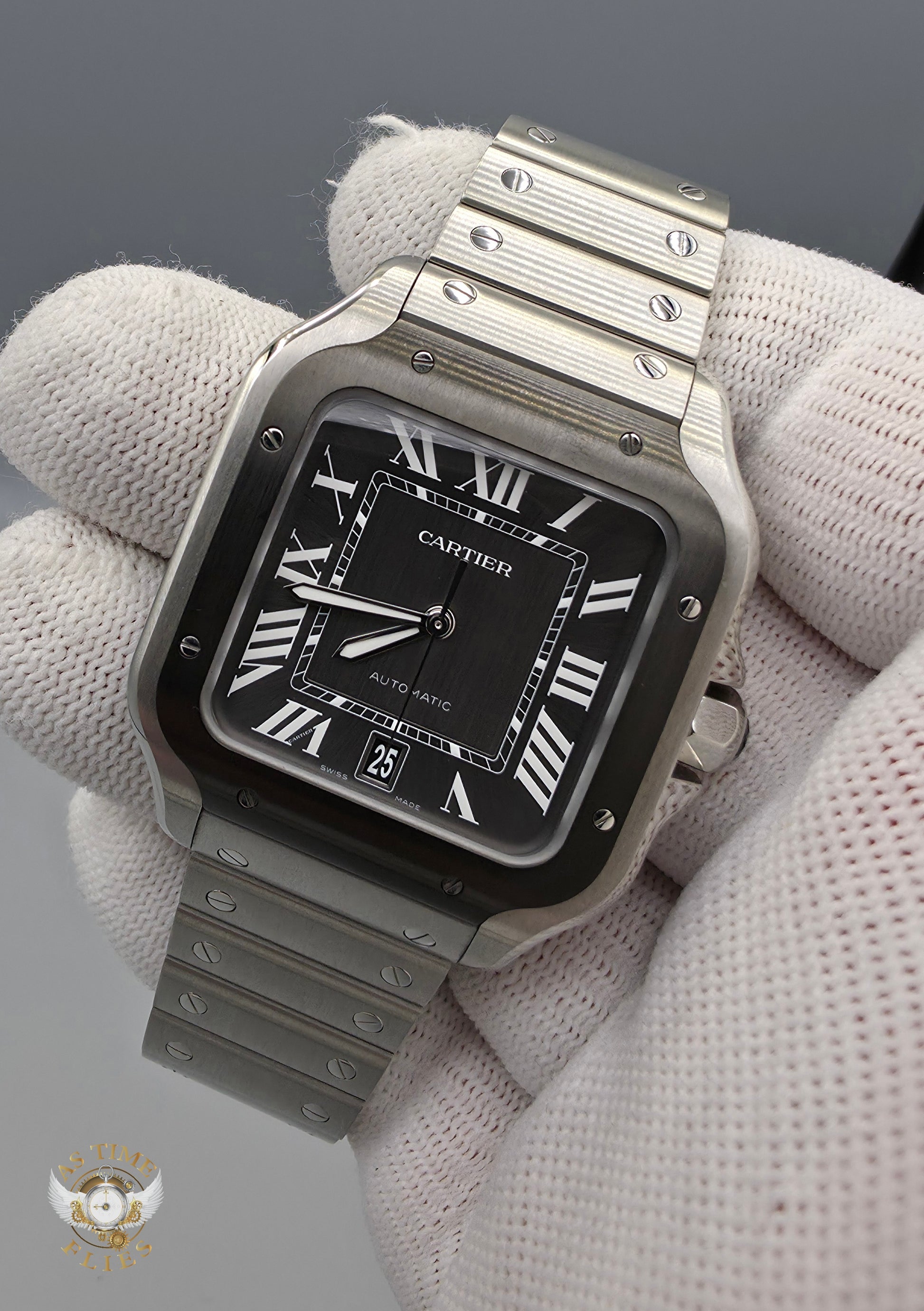 The dial remains quintessentially Cartier: bold Roman numerals, sword-shaped hands, and a crisply framed square layout that prioritizes symmetry and legibility. The sunburst grey dial introduces depth and texture, shifting subtly with the light, while the date aperture at 6 o’clock is integrated with restraint. Surrounding the dial is a black ADLC-coated bezel, its matte finish providing contrast against the brushed stainless steel case and reinforcing the watch’s modern, almost industrial character. Exposed screws—an enduring Santos signature—serve as both functional elements and visual anchors, underscoring the watch’s structural honesty.