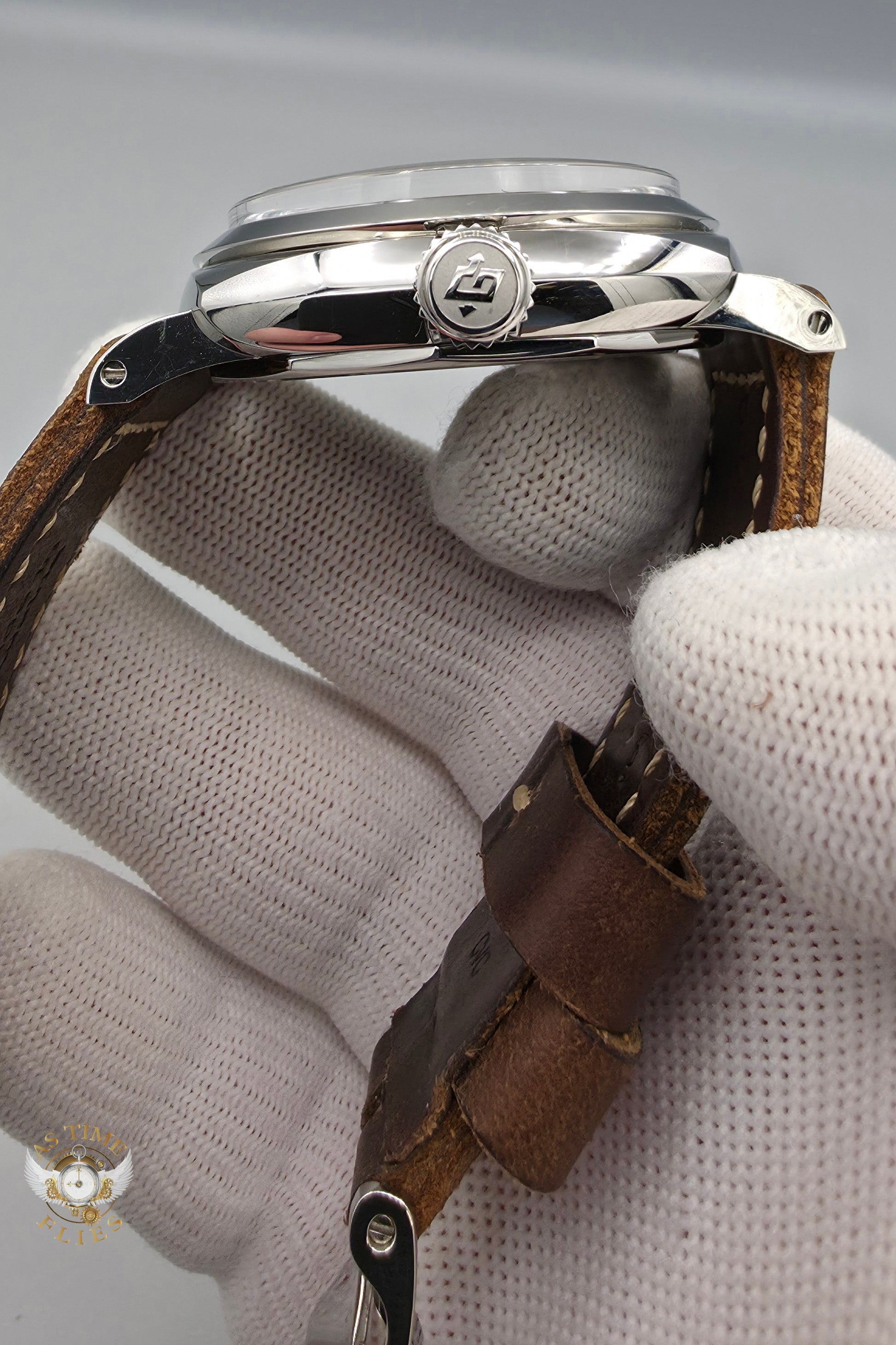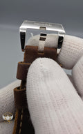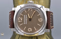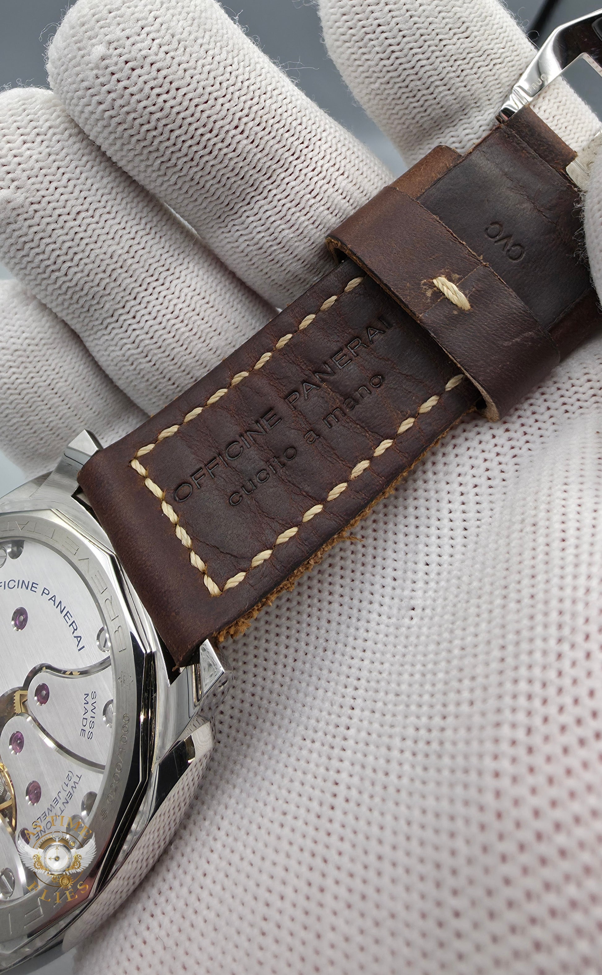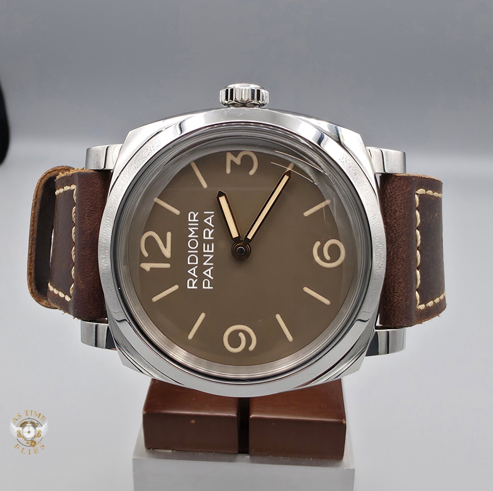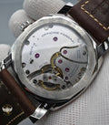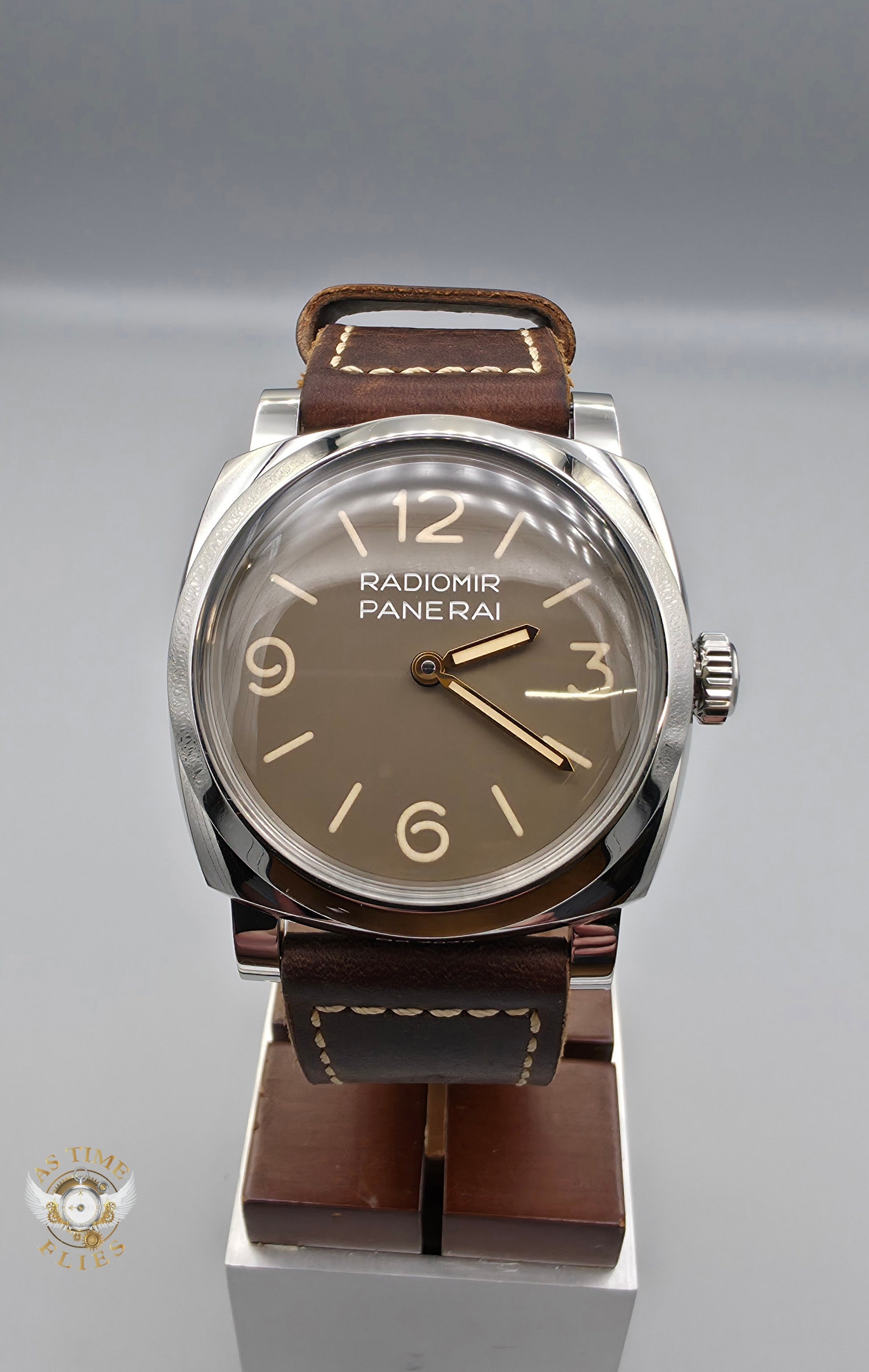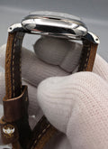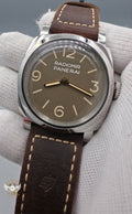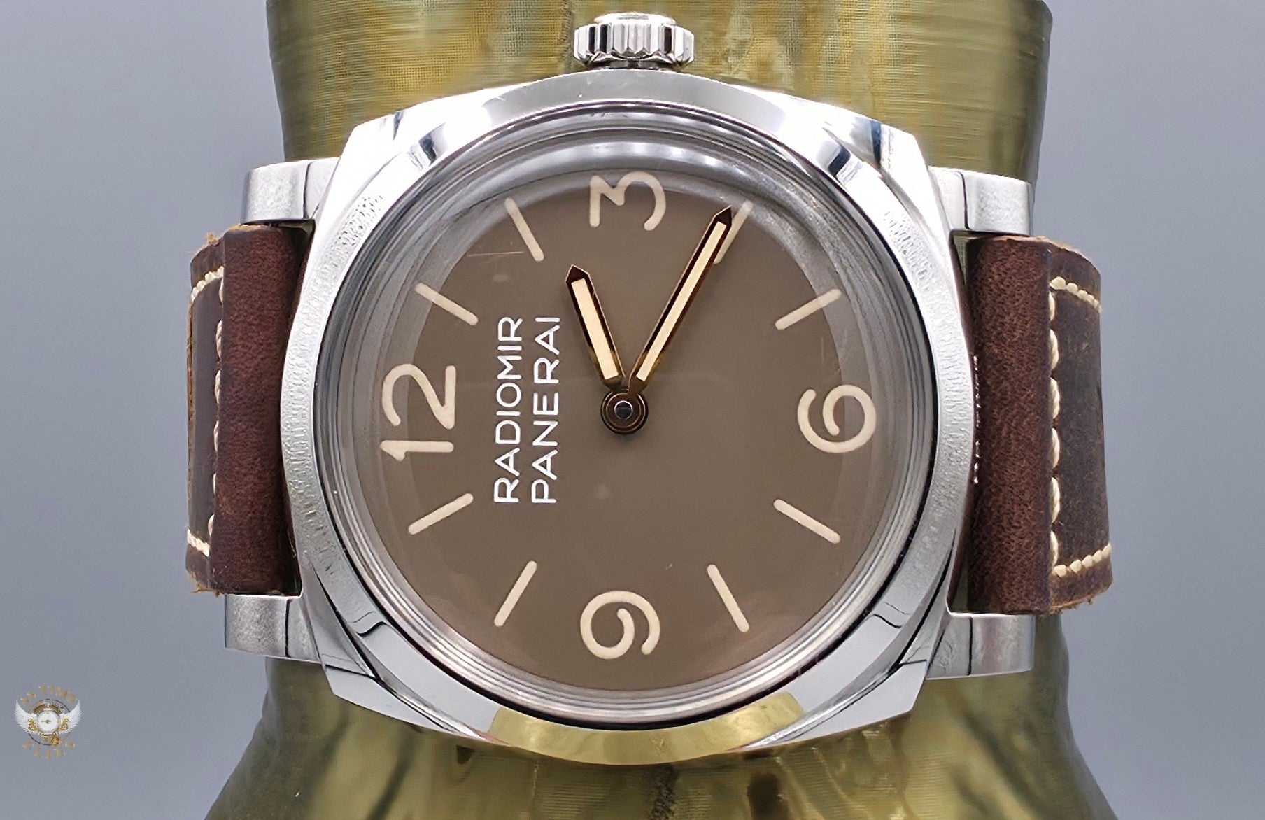 The standout feature is the extraordinary brown “California” dial, combining Arabic and Roman numerals in a configuration rooted in early military and naval timepieces. Its warm café-au-lait tone subtly shifts under different lighting conditions, giving the watch remarkable depth and character. Rose-gold-toned hands and luminous markers add contrast and warmth, while the engraved “RADIOMIR PANERAI” signature reinforces its vintage authenticity. A domed Plexiglas crystal completes the period-correct aesthetic, intentionally chosen for its softer distortions and historical accuracy, even as it recalls an era before modern sapphire crystals.