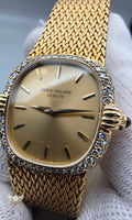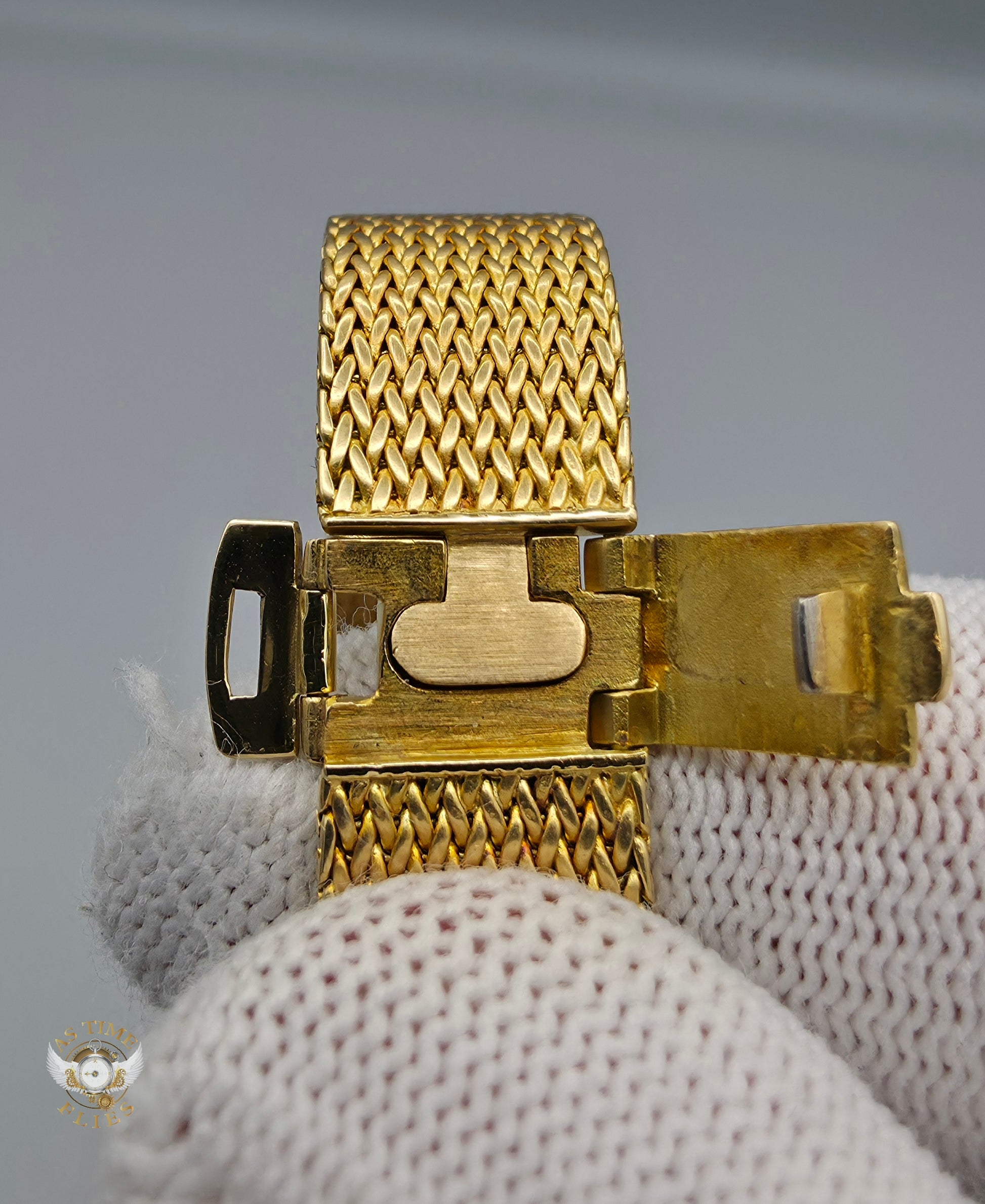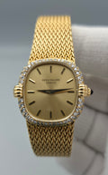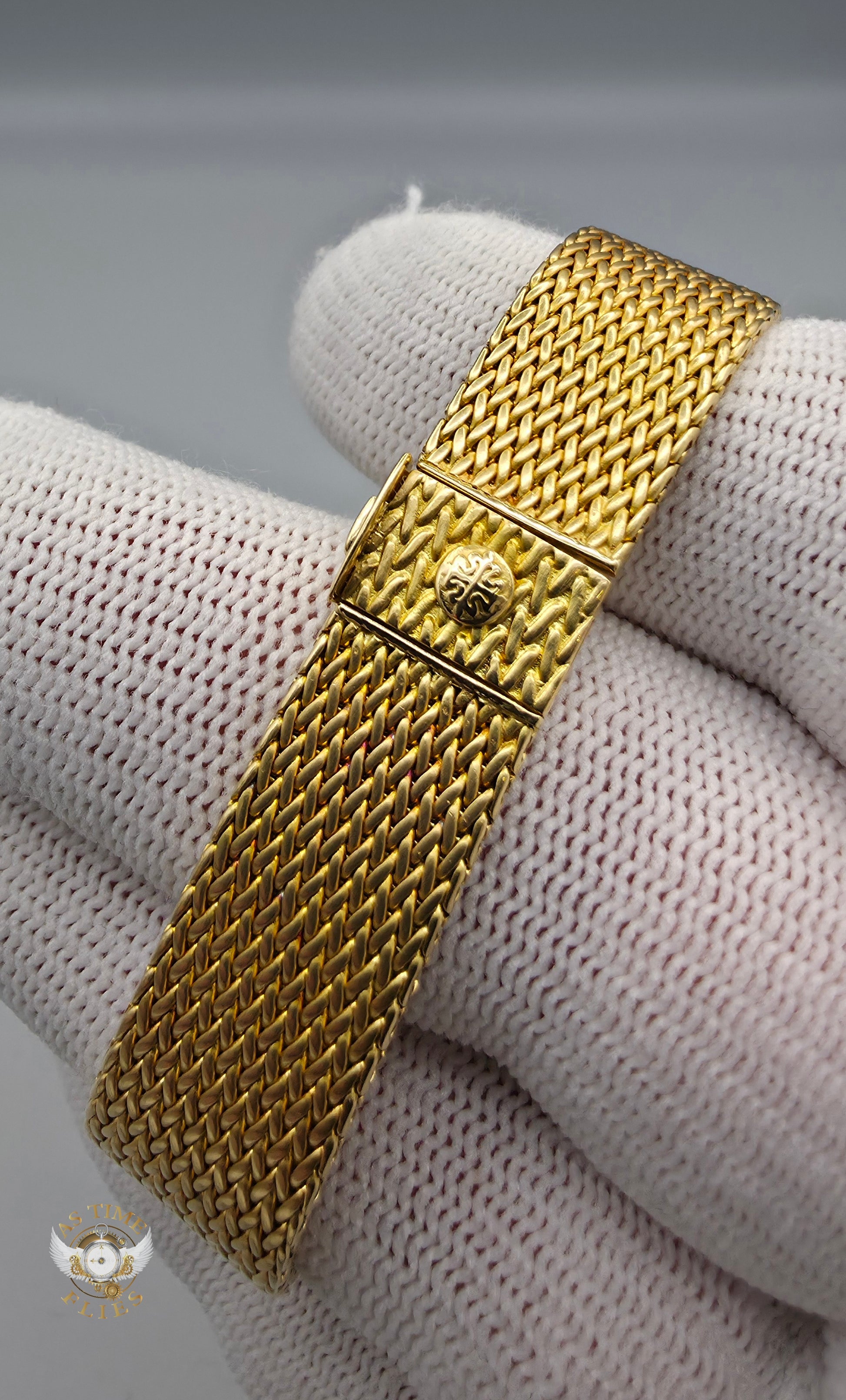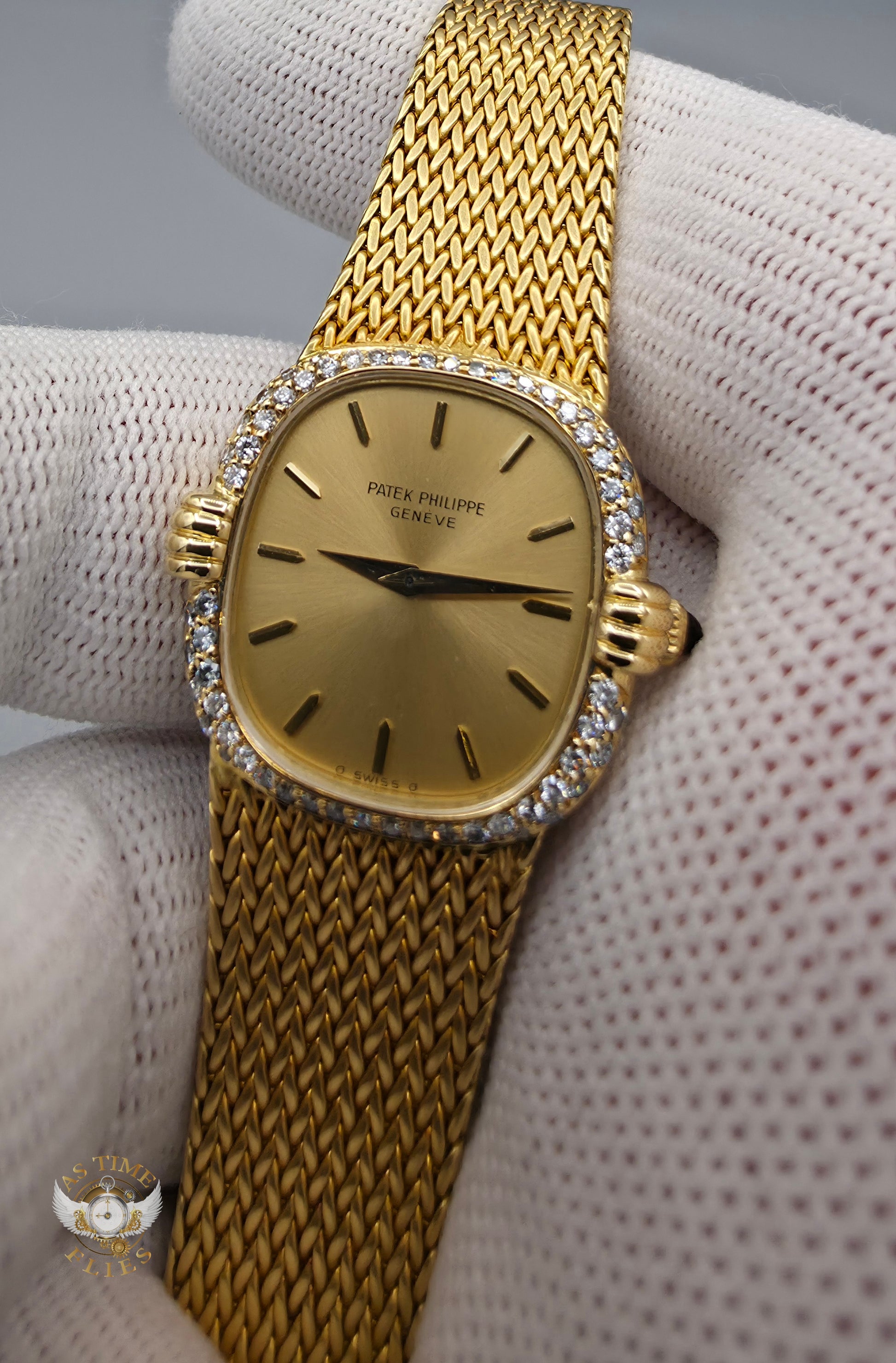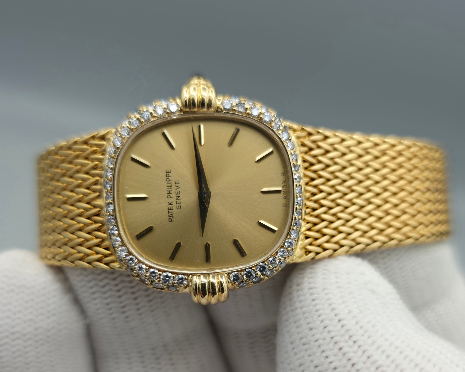 Crafted entirely in 18k yellow gold, the case is paired with an exceptional integrated yellow-gold woven bracelet, a hallmark of high-period Patek Philippe production. The bracelet drapes fluidly around the wrist, offering both visual richness and remarkable comfort, while the signed clasp underscores the piece’s integrity and originality. The warm gold tones are complemented by a diamond-set bezel, adding a discreet layer of brilliance without disturbing the watch’s fundamental elegance.
