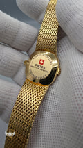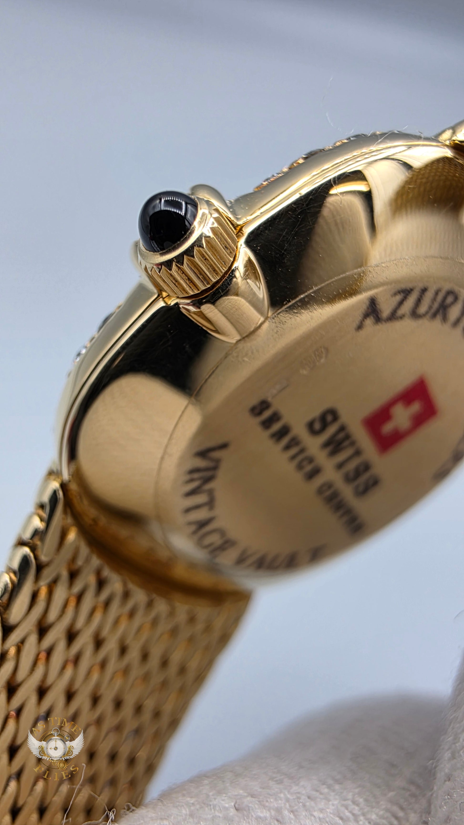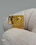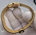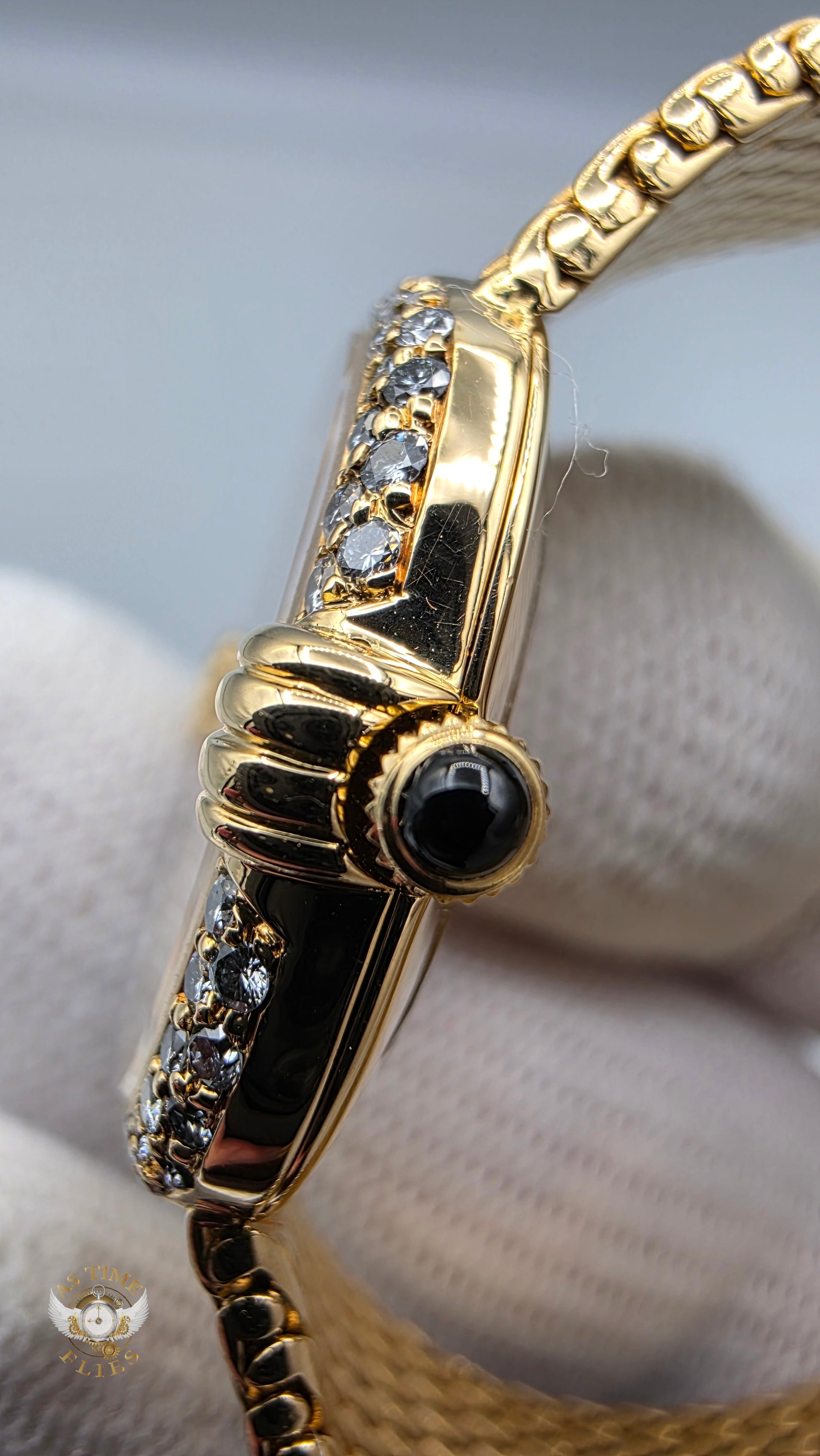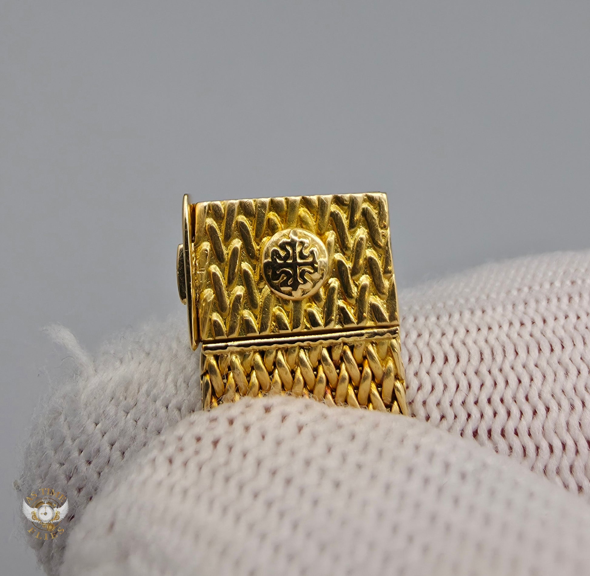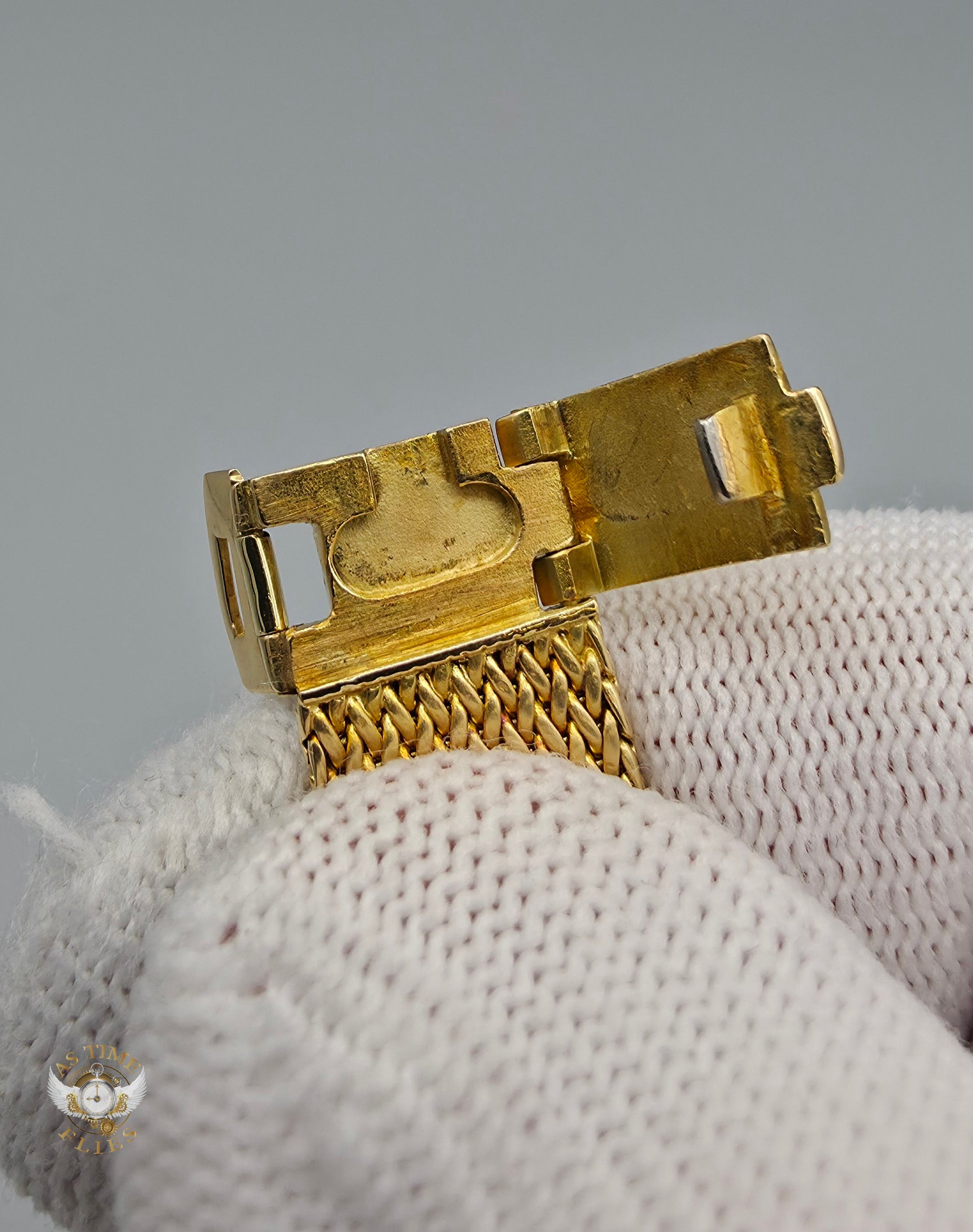 Crafted entirely in 18k yellow gold, the case is paired with an exceptional integrated yellow-gold woven bracelet, a hallmark of high-period Patek Philippe production. The bracelet drapes fluidly around the wrist, offering both visual richness and remarkable comfort, while the signed clasp underscores the piece’s integrity and originality. The warm gold tones are complemented by a diamond-set bezel, adding a discreet layer of brilliance without disturbing the watch’s fundamental elegance.