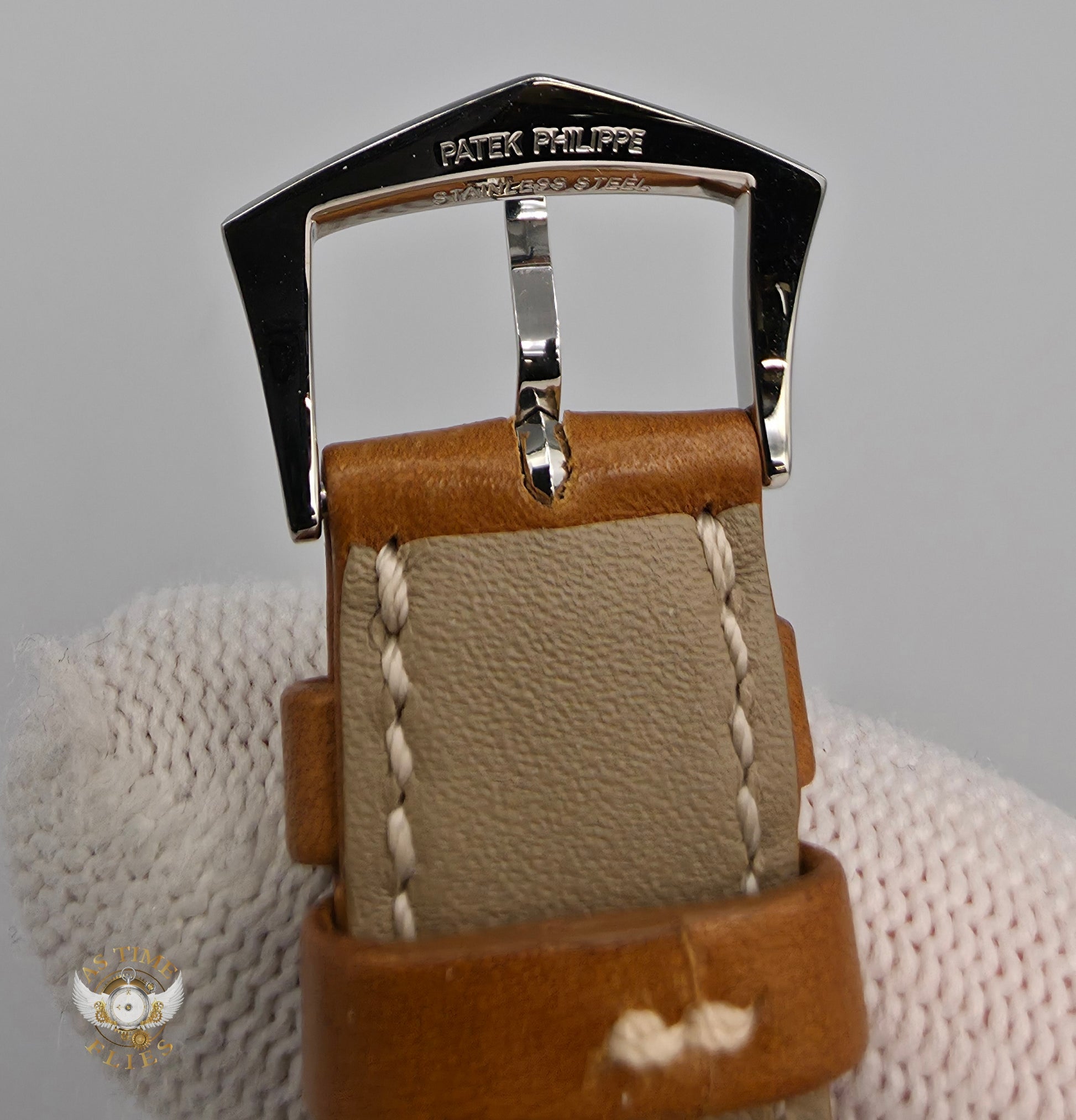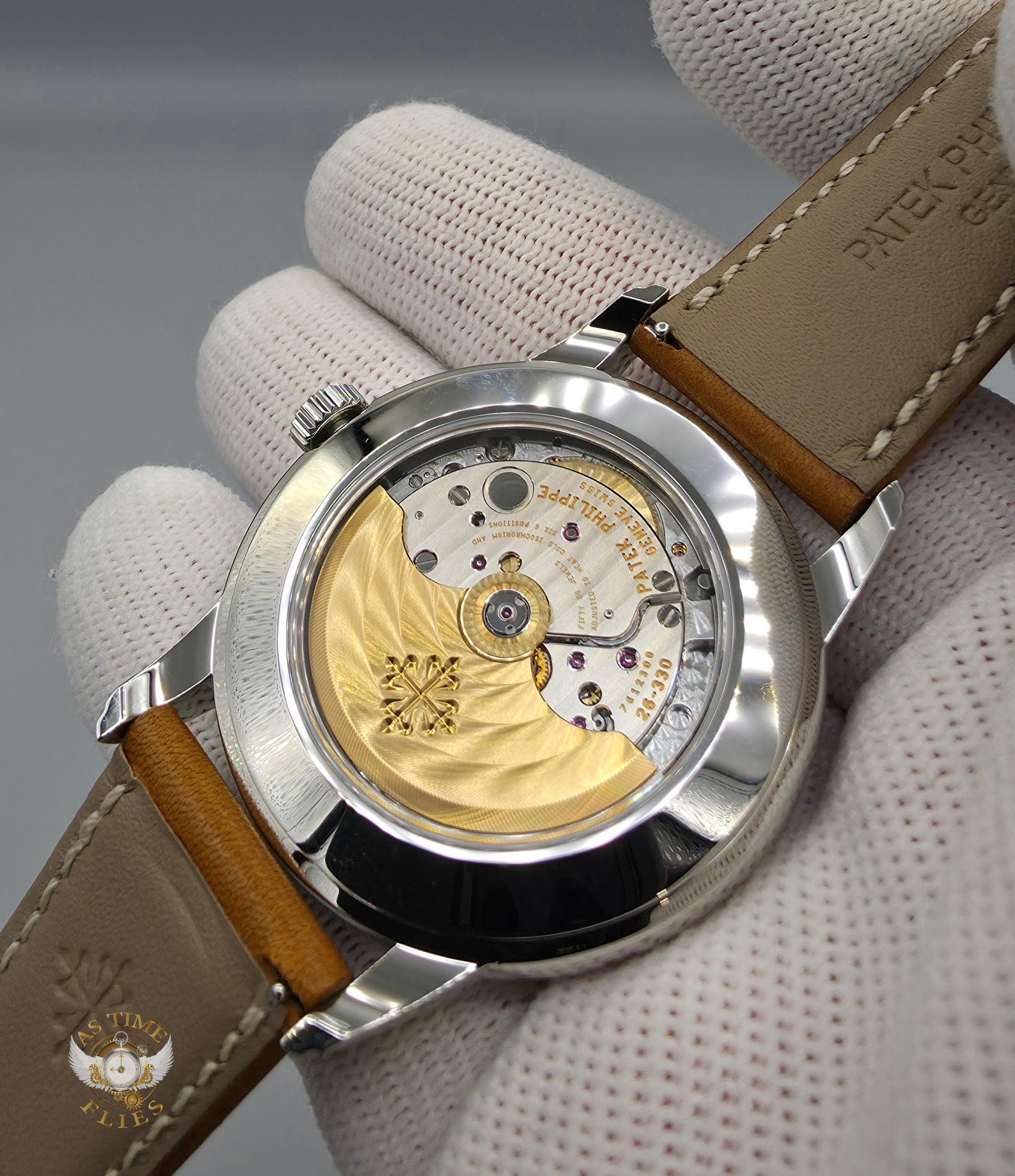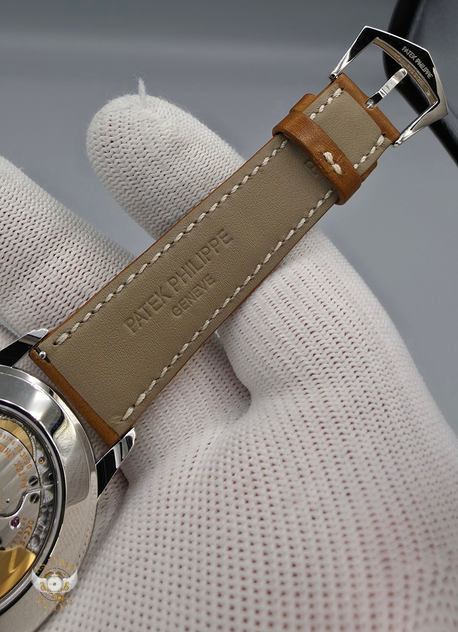 The 40mm stainless steel case measures just 10.79mm thick, ensuring a slim, elegant profile on the wrist. Subtle architectural details, including the two-tier case and lugs, add visual refinement while preserving the timeless Calatrava silhouette. A sapphire crystal case back reveals the movement within, while water resistance to 30 meters reinforces the watch’s suitability for everyday wear. The watch is paired with a hand-stitched light brown calfskin strap secured by a steel prong buckle, completing the understated yet elevated aesthetic.