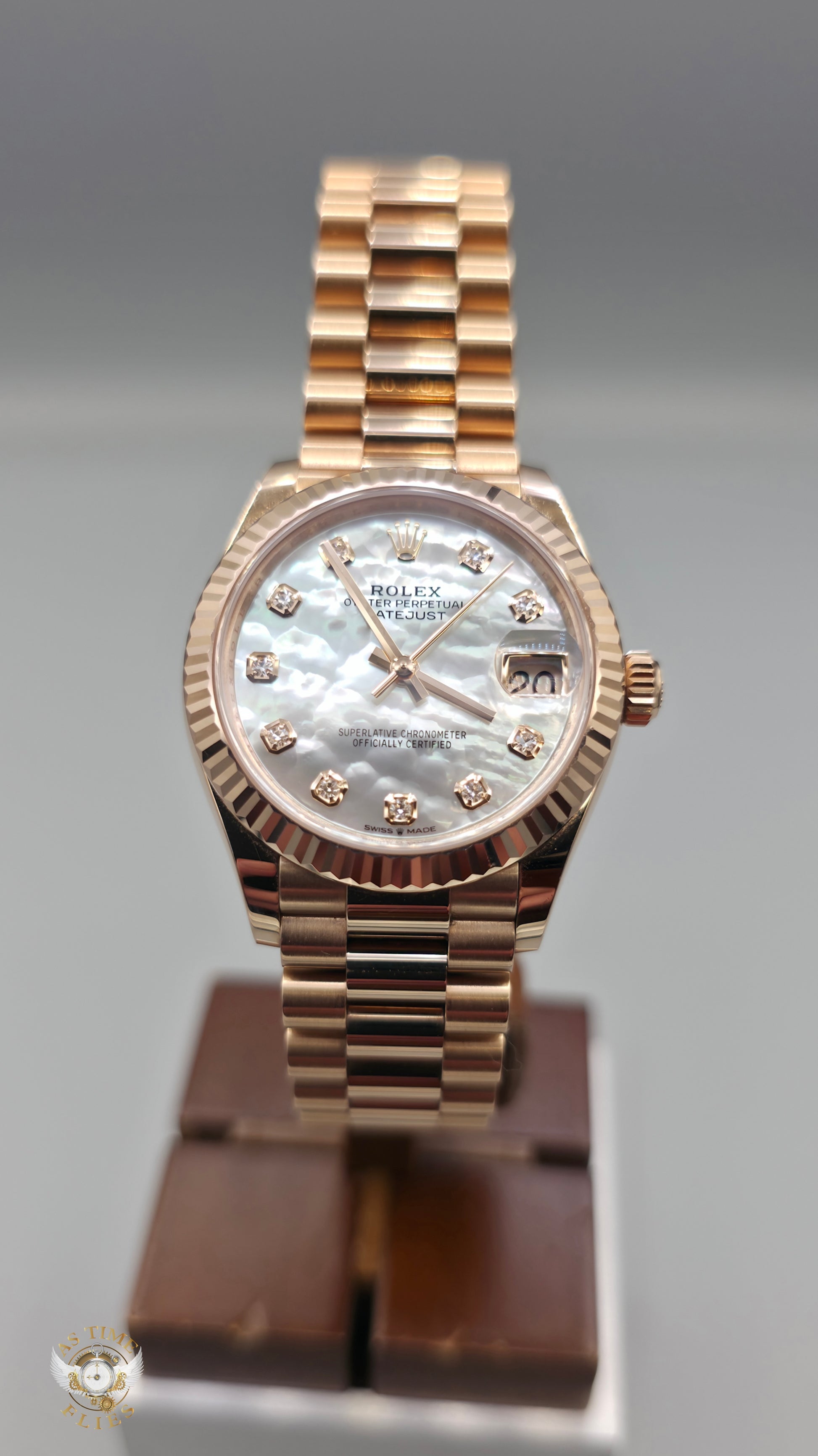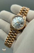 The watch is distinguished by its mother-of-pearl dial, whose natural iridescence ensures no two examples are ever exactly alike. Set with diamond hour markers, the dial plays beautifully with light, shifting from soft silvers to warm pearlescent tones depending on the angle. The iconic Cyclops lens magnifies the date at 3 o’clock, maintaining the Datejust’s instantly recognizable identity while anchoring the design in Rolex tradition.