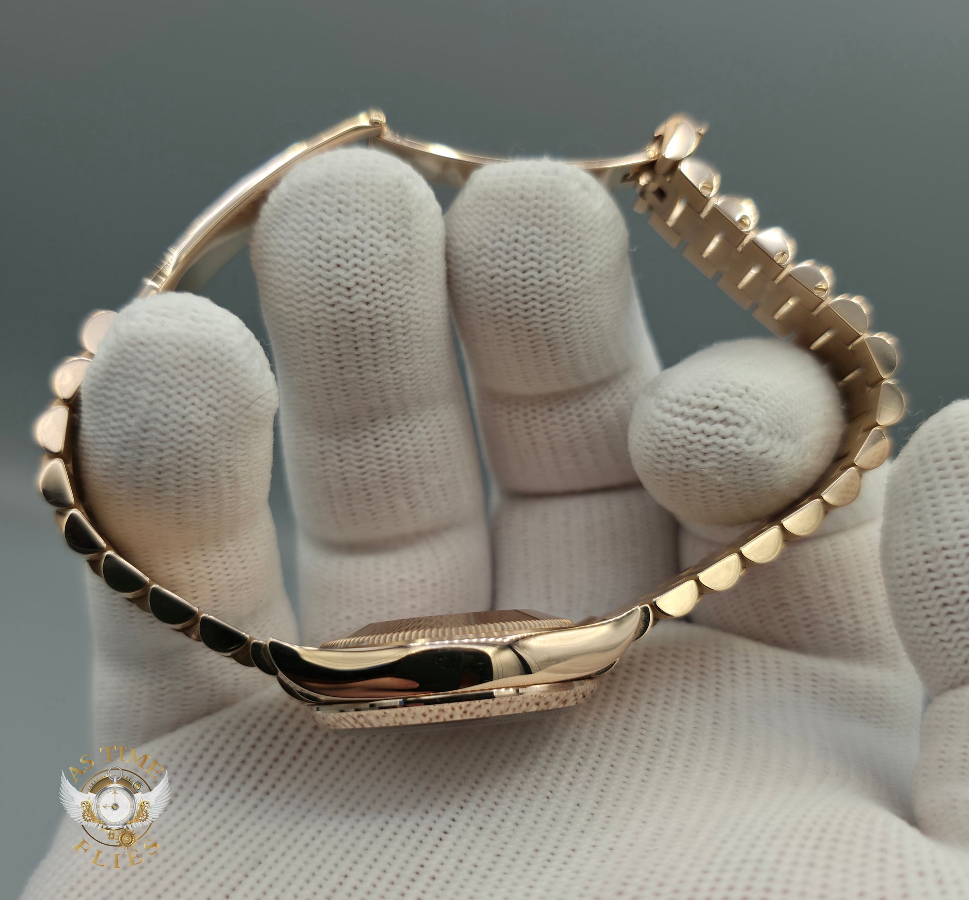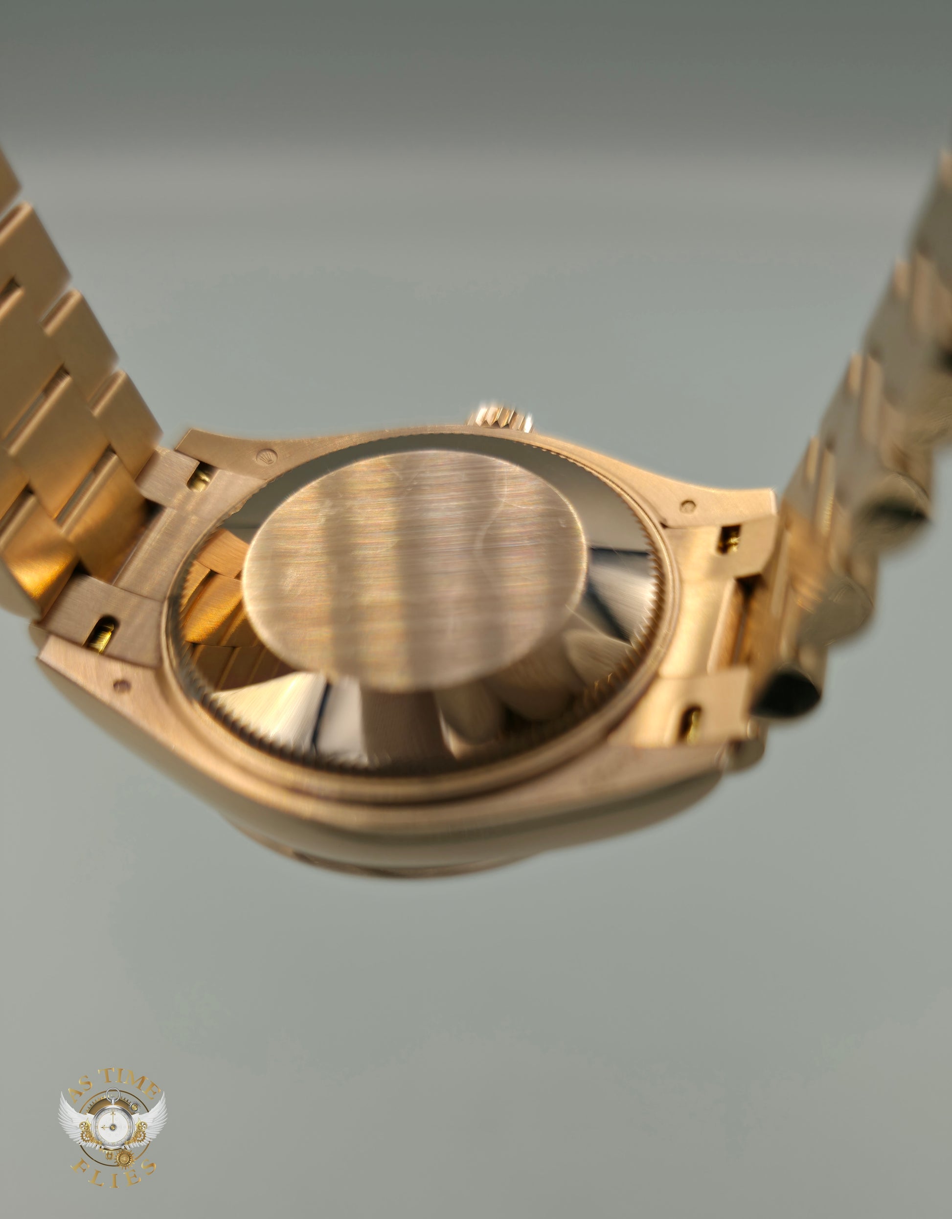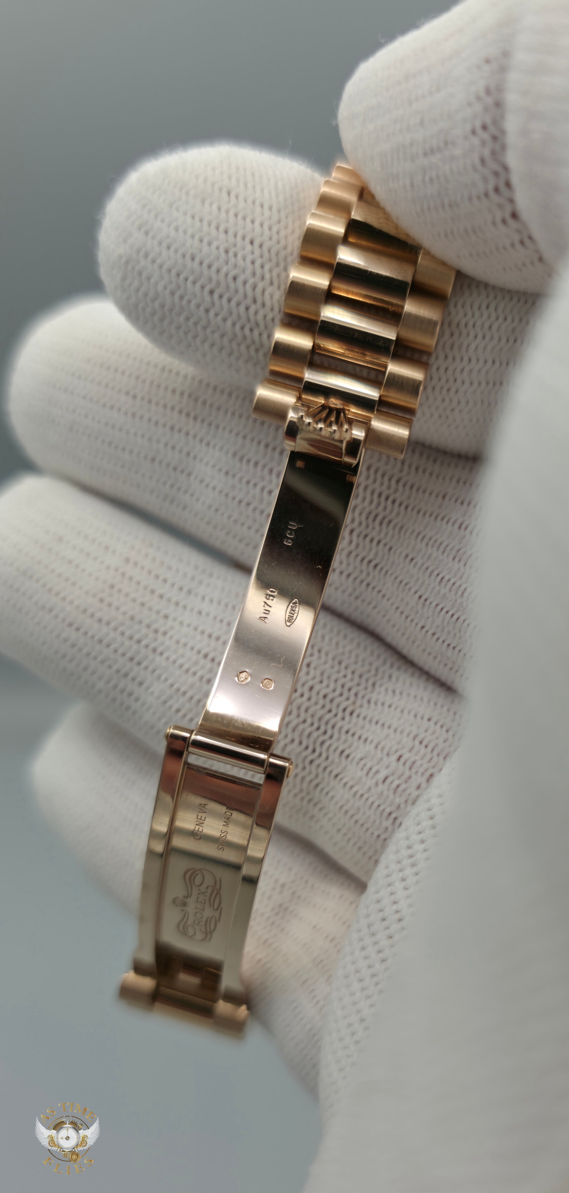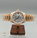 Framing the dial is a fluted Everose gold bezel, a hallmark Rolex design element that adds depth, brilliance, and unmistakable character. The case flows seamlessly into the President bracelet, also crafted in solid Everose gold, with semi-circular links that drape effortlessly on the wrist. This bracelet is as much a signature of prestige as it is a triumph of comfort and finishing.