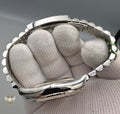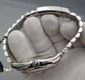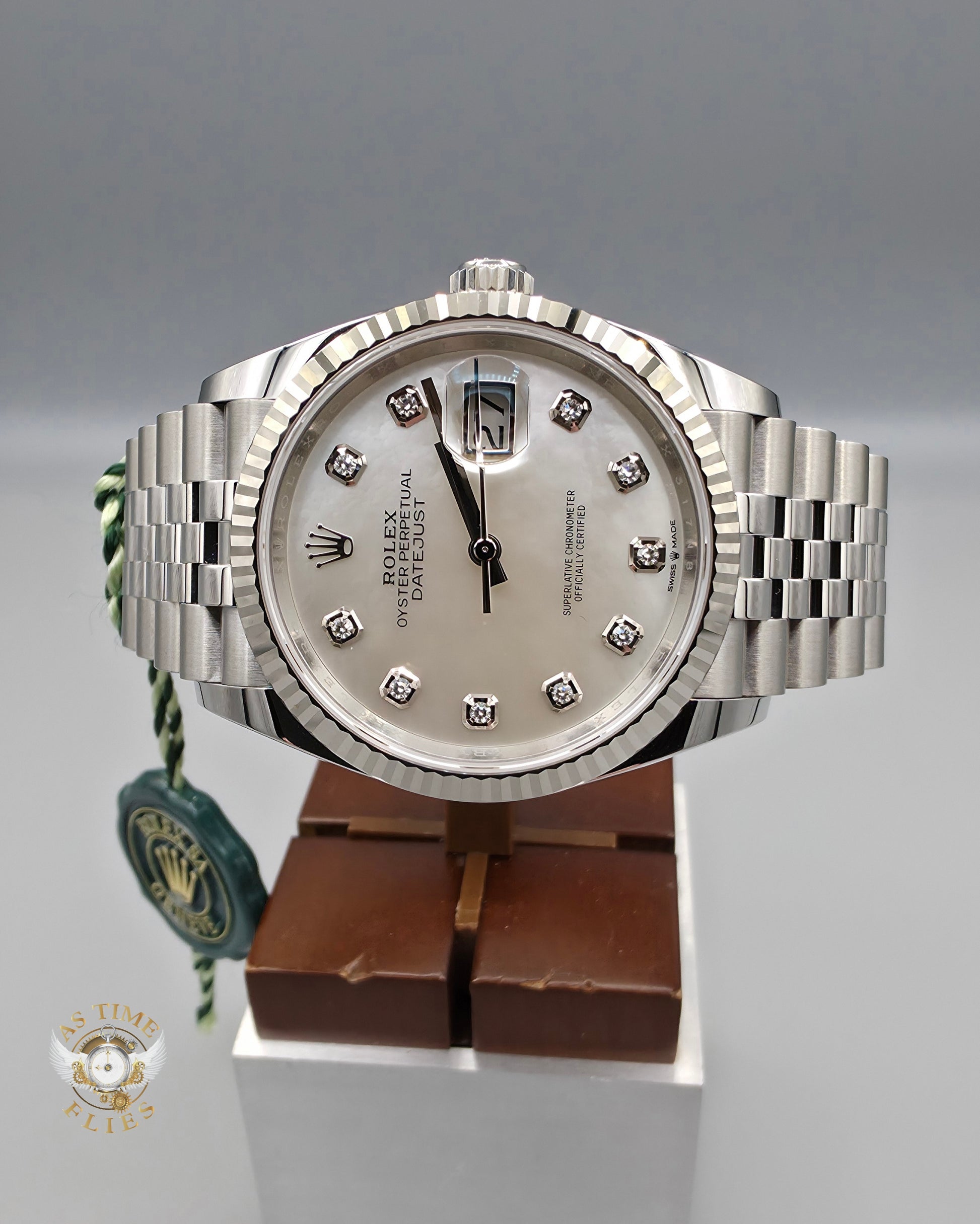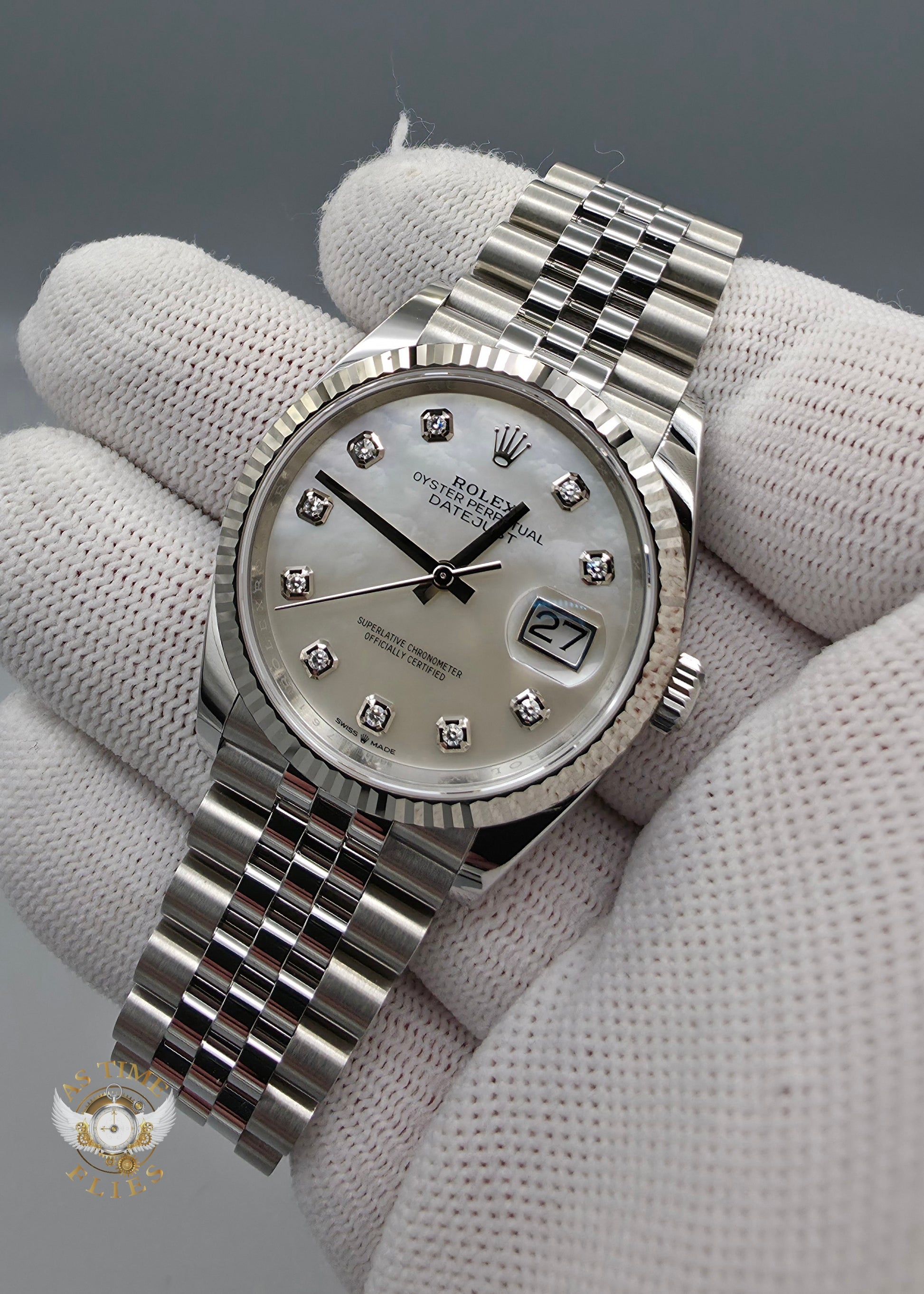 The dial is a standout feature: a luminous white mother-of-pearl surface that shifts subtly with the light, offering depth and elegance impossible to replicate. Applied diamond hour markers, set in white gold surrounds, elevate the dial without excess, maintaining the Datejust’s signature restraint. The classic Cyclops magnifier at 3 o’clock ensures instant legibility of the date — a defining hallmark that has become synonymous with Rolex itself.