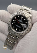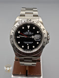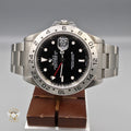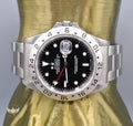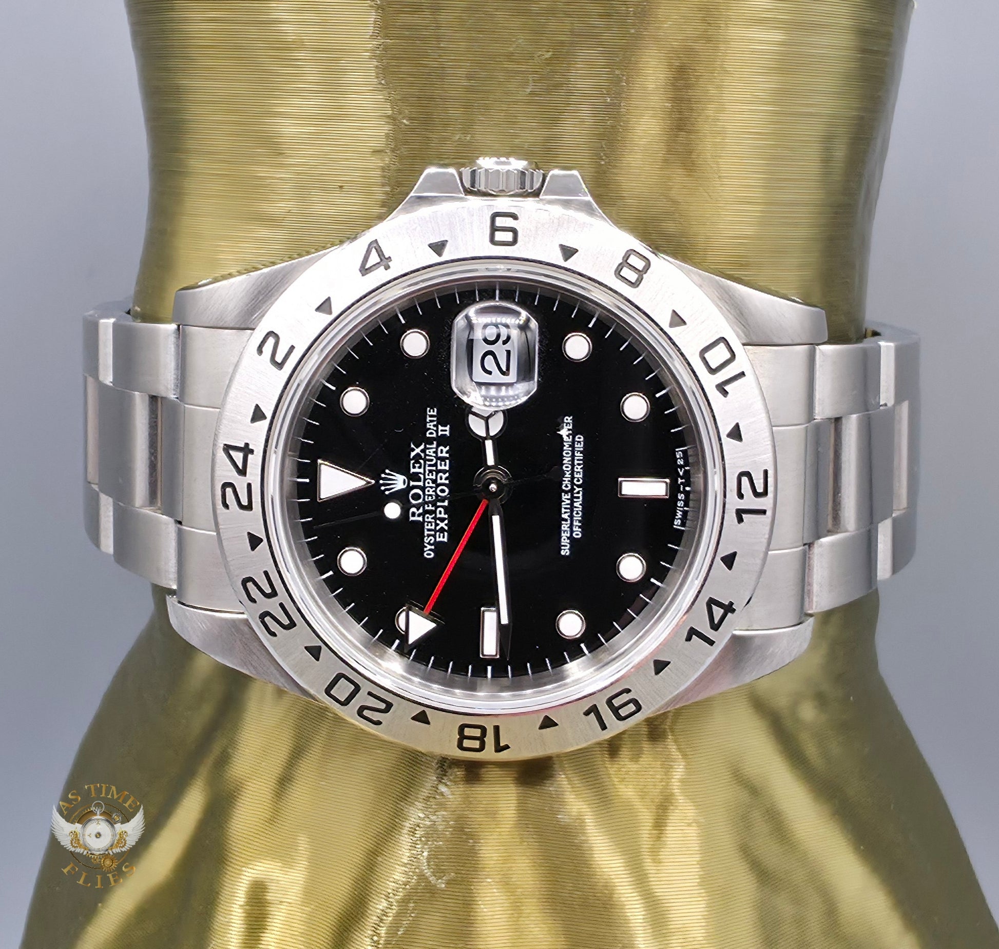 This example features the black dial configuration, offering a crisp, high-contrast layout with applied luminous hour markers, Mercedes hands, and the signature red 24-hour hand—a defining aesthetic of the Explorer II line. The fixed brushed stainless-steel bezel is engraved with a 24-hour scale, allowing the wearer to track a second time zone or distinguish day from night at a glance. The matte black dial lends the watch a purposeful, no-nonsense appearance, reinforcing its origins as a true expedition instrument rather than a dress-leaning sports watch.