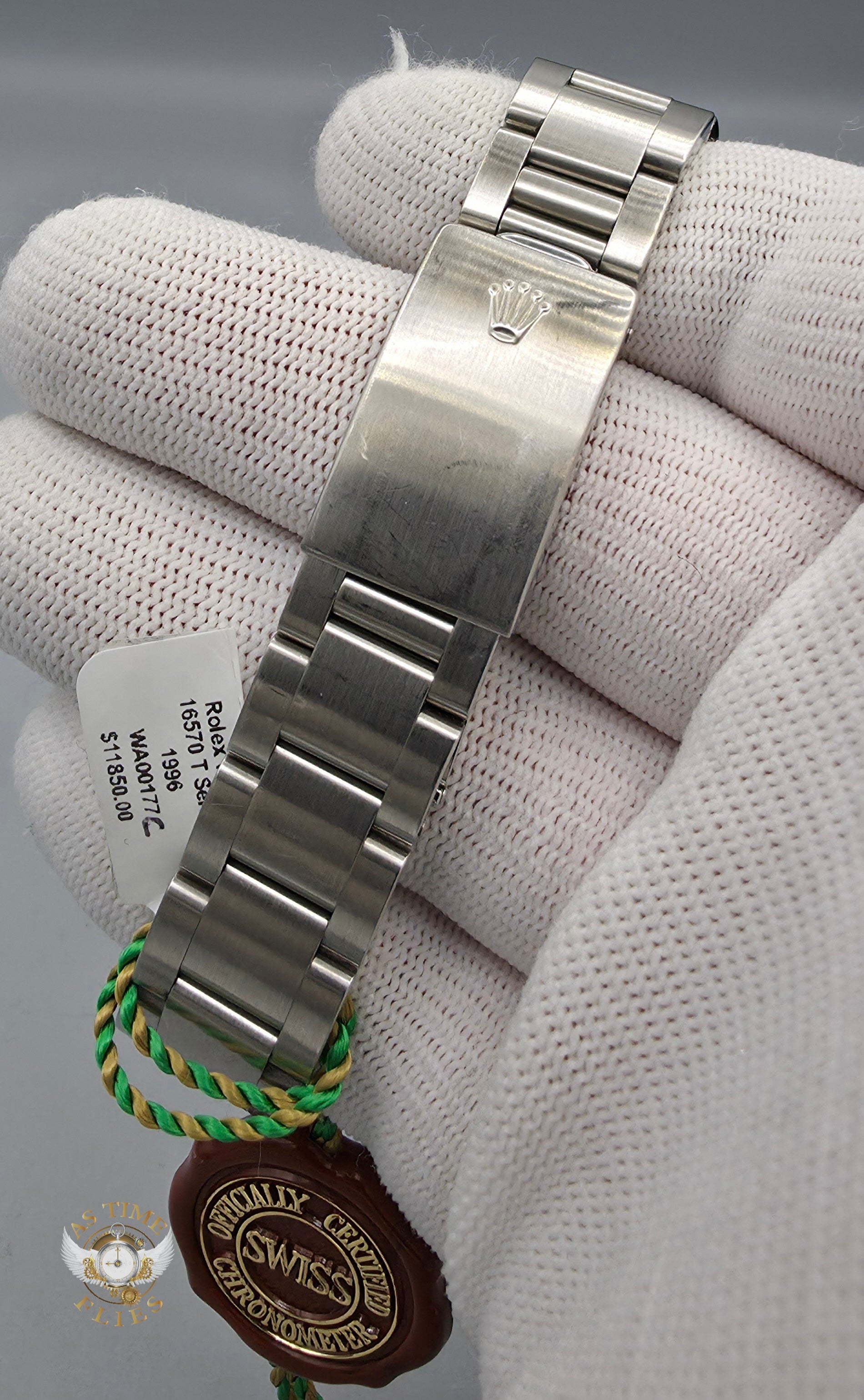 Housed in a 40 mm Oystersteel case, the Ref. 16570 wears exceptionally well thanks to its slim profile and clean case geometry. It is paired with the correct Oyster bracelet (Ref. 78360), featuring solid links and a folding Oysterlock clasp, delivering both comfort and durability. The brushed finishing throughout emphasizes its tool-watch DNA while remaining versatile enough for everyday wear.