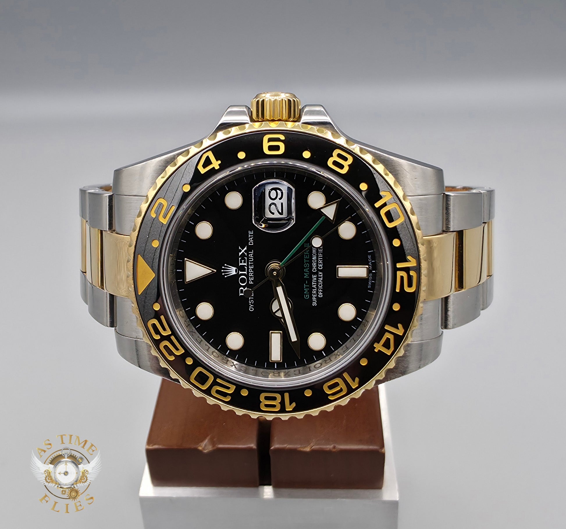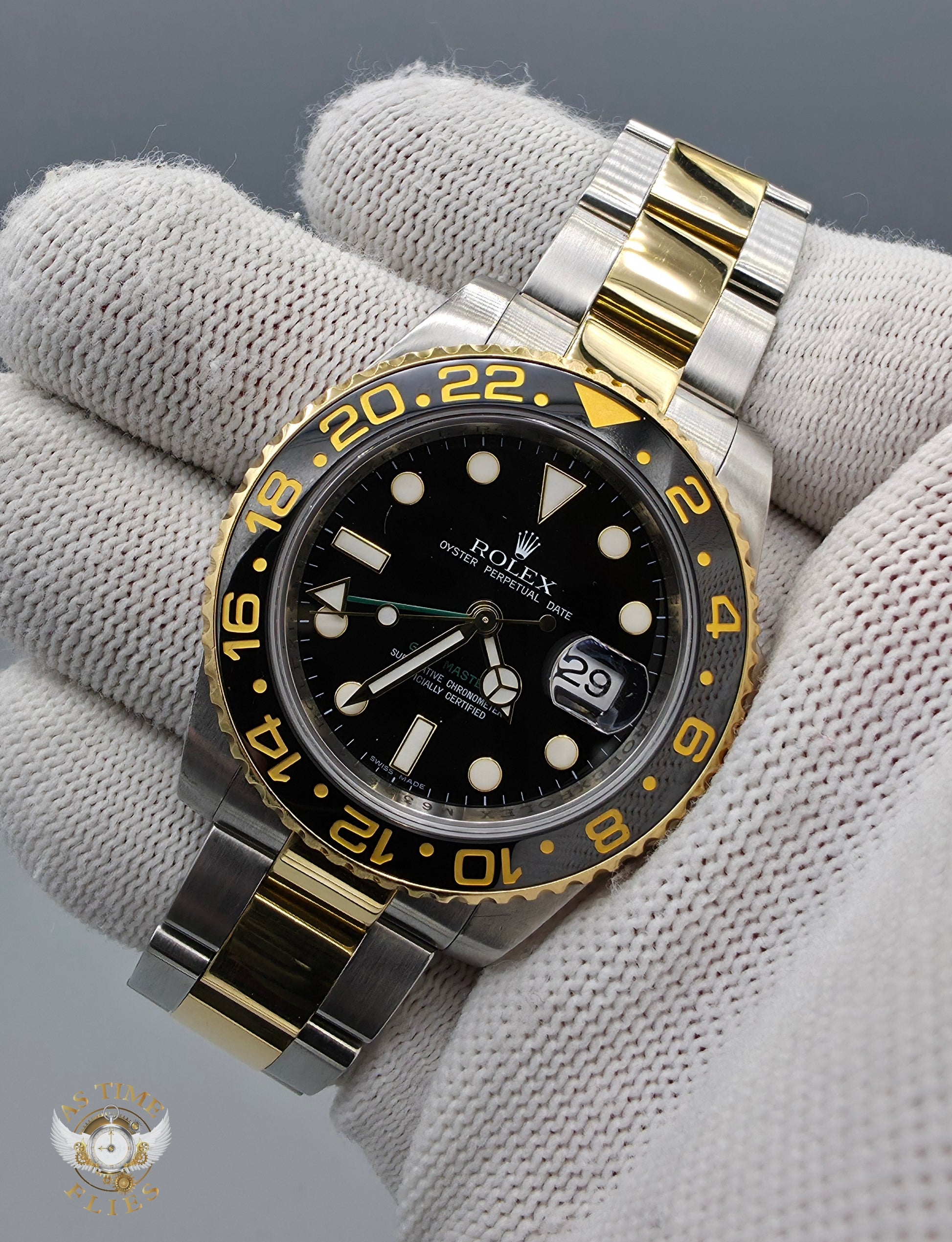 The Rolex GMT-Master II represents one of the most balanced and charismatic executions of the modern GMT lineage, blending professional functionality with unmistakable luxury. Introduced as the Rolesor (steel and yellow gold) variant of the GMT-Master II, the 116713LN pairs a robust Oystersteel case with an 18k yellow gold bezel, crown, and center bracelet links—creating a watch that is equally at home in the cockpit, boardroom, or at leisure.