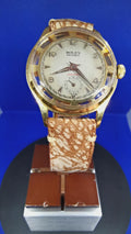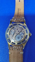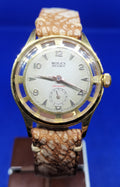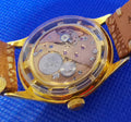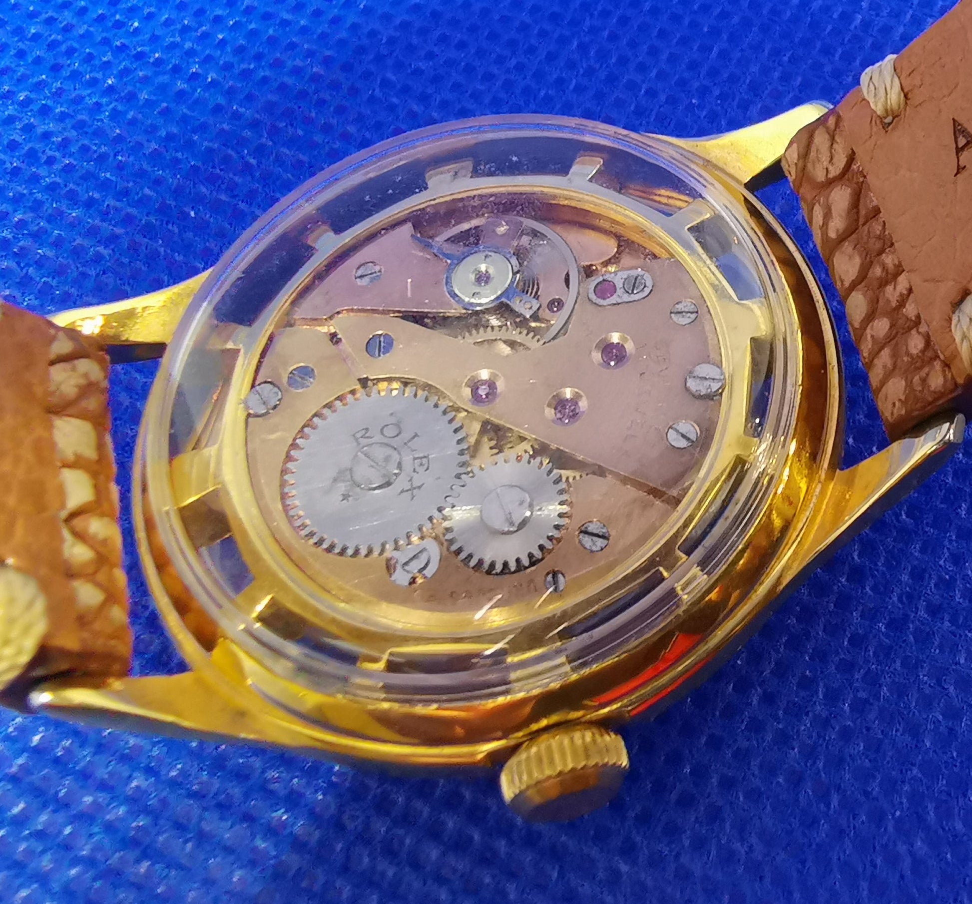 This is far from an all-original watch, the interestingly-textured dial marked by "Swiss" at the 6 hour marker including the subseconds dial, the silvered dagger markers highlighted by offsetting hour markers and copper dauphine hands were placed in a skeletonized gold-plated case coupled to a factory and period correct gold Rolex crown. This watch has had a recent service.