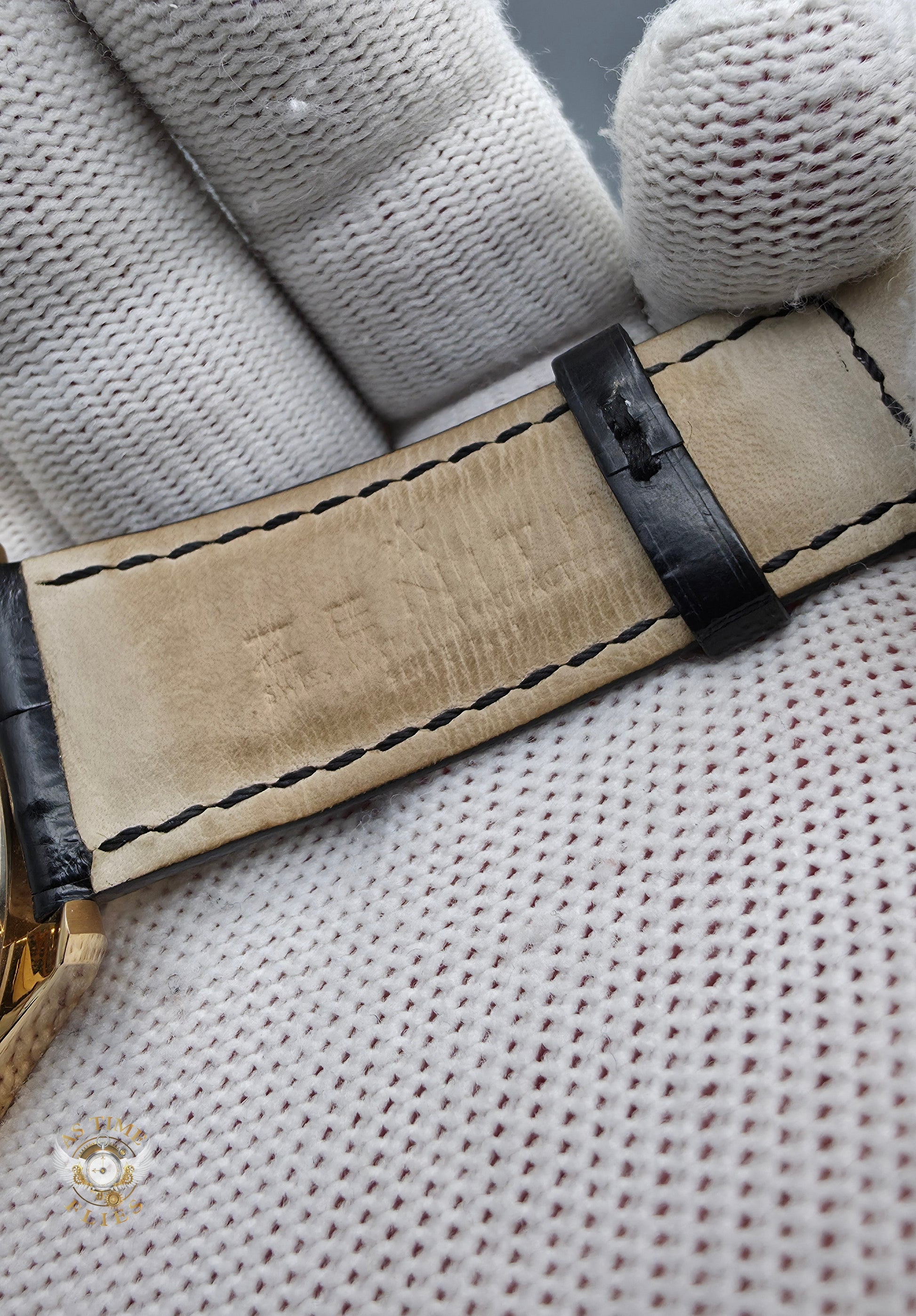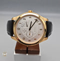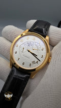 The dial is rich in detail yet remarkably composed. A crisp white base frames a finely textured guilloché center, creating subtle contrast and depth. Applied Arabic numerals, blued steel hands, and carefully printed minute markers ensure excellent legibility while reinforcing the watch’s traditional character. At 6 o’clock, a recessed small-seconds subdial anchors the layout, while the fan-shaped power reserve indicator at 11 o’clock introduces a touch of technical elegance. A discreet date window at 3 o’clock completes the dial, adding everyday practicality without disrupting the symmetry.